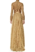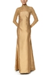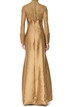 Vestido longo da marca Dina Barcelos. Confeccionado no tecido zibeline em tom dourado. Peça seminova em excelente estado de conservação. Apresenta sinais muito sutis de uso.